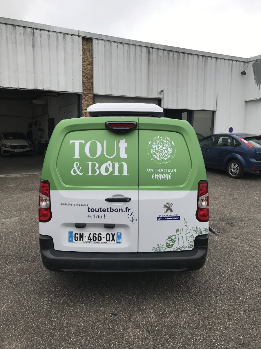 Ce dernier comprend la partie haute en adhésif spécial véhicule Avery ainsi qu'un flocage en semi découpe a l'image de son activité.